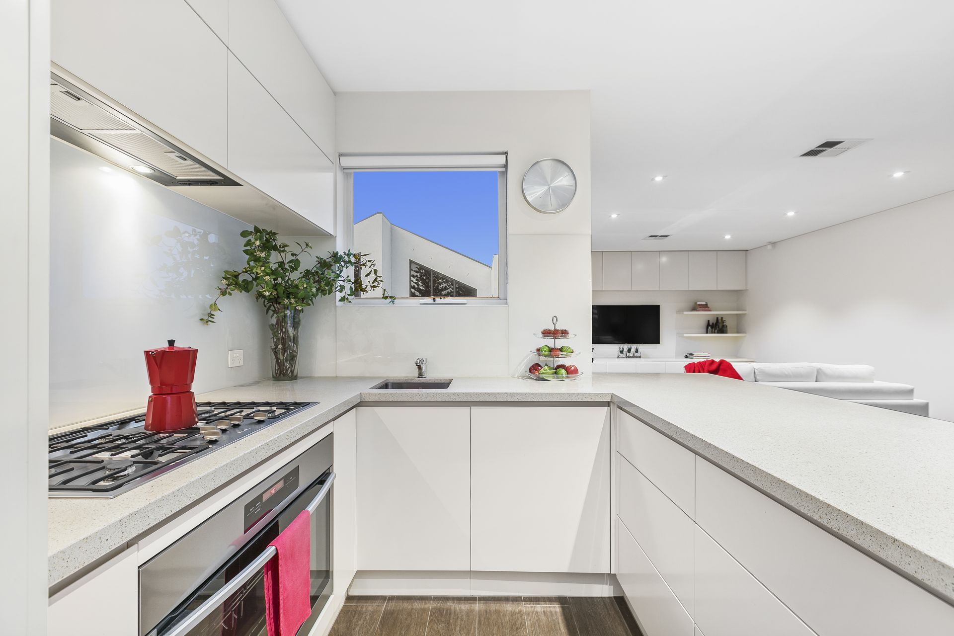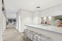 Two expansive living areas with a centrally located kitchen with stone bench tops, glass splash back, 900mm oven and cook top and integrated fridge and dishwasher all wrapped around a large balcony (182 approx) with an automated awning.